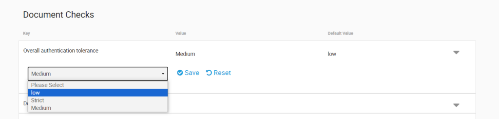 Document Level Tolerance can also be defined on a per document type level. The following section allow Administrators to select specific document types by Country and Type and set tolerance levels for that specific type of document.